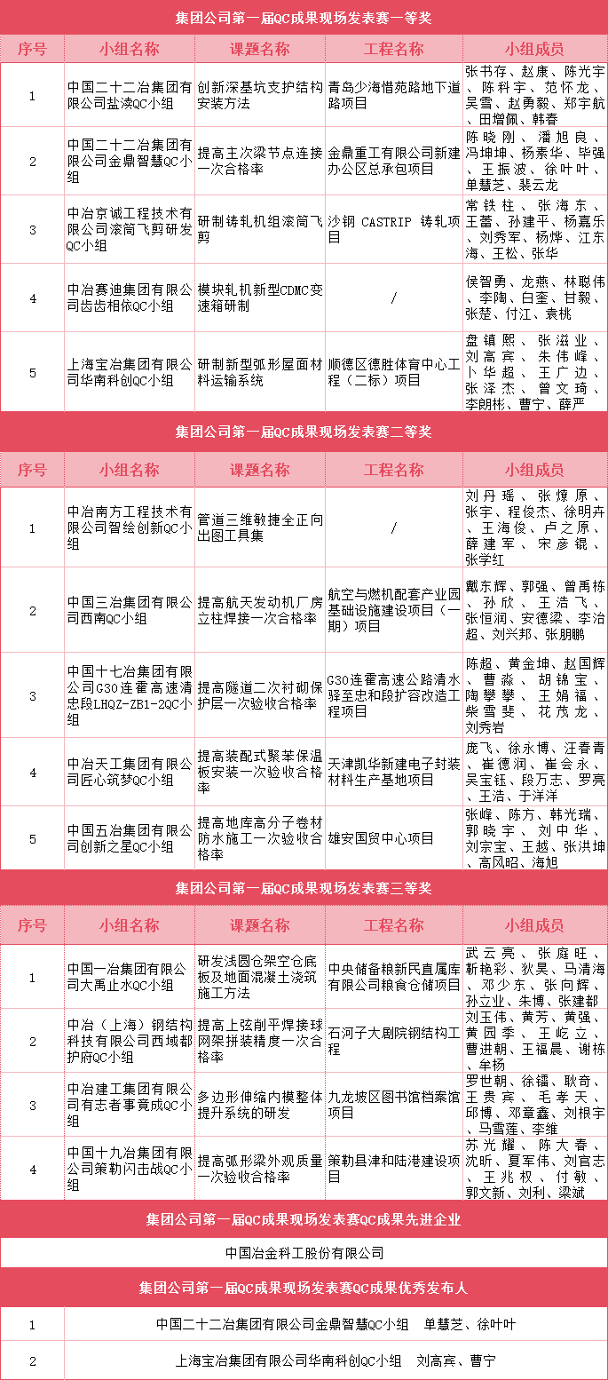 1月28日,由集團公司企業(yè)管理部主辦,中國二十二冶集團有限公司承辦的集團公司第一屆QC成果現(xiàn)場發(fā)表賽活動在河北唐山召開。本次活動中,公司組織推薦13家子企業(yè)的14項質(zhì)量管理小組成果斬獲佳績,其中一等獎5項、二等獎5項、三等獎4項。此外,中國冶金科工股份有限公司榮獲集團公司“QC成果先進企業(yè)”,中國二十二冶集團有限公司單慧芝、徐葉葉,上海寶冶集團有限公司劉高賓、曹寧榮獲集團公司“QC成果優(yōu)秀發(fā)布人”。QC小組活動的扎實開展,有利于激發(fā)現(xiàn)場人員解決質(zhì)量問題、實施質(zhì)量改進的積極性和創(chuàng)造性,推進質(zhì)量人員素質(zhì)和意識有效提升,營造“全員參與質(zhì)量,人人關(guān)心質(zhì)量”的氛圍,以實際行動助推企業(yè)高質(zhì)量發(fā)展。
